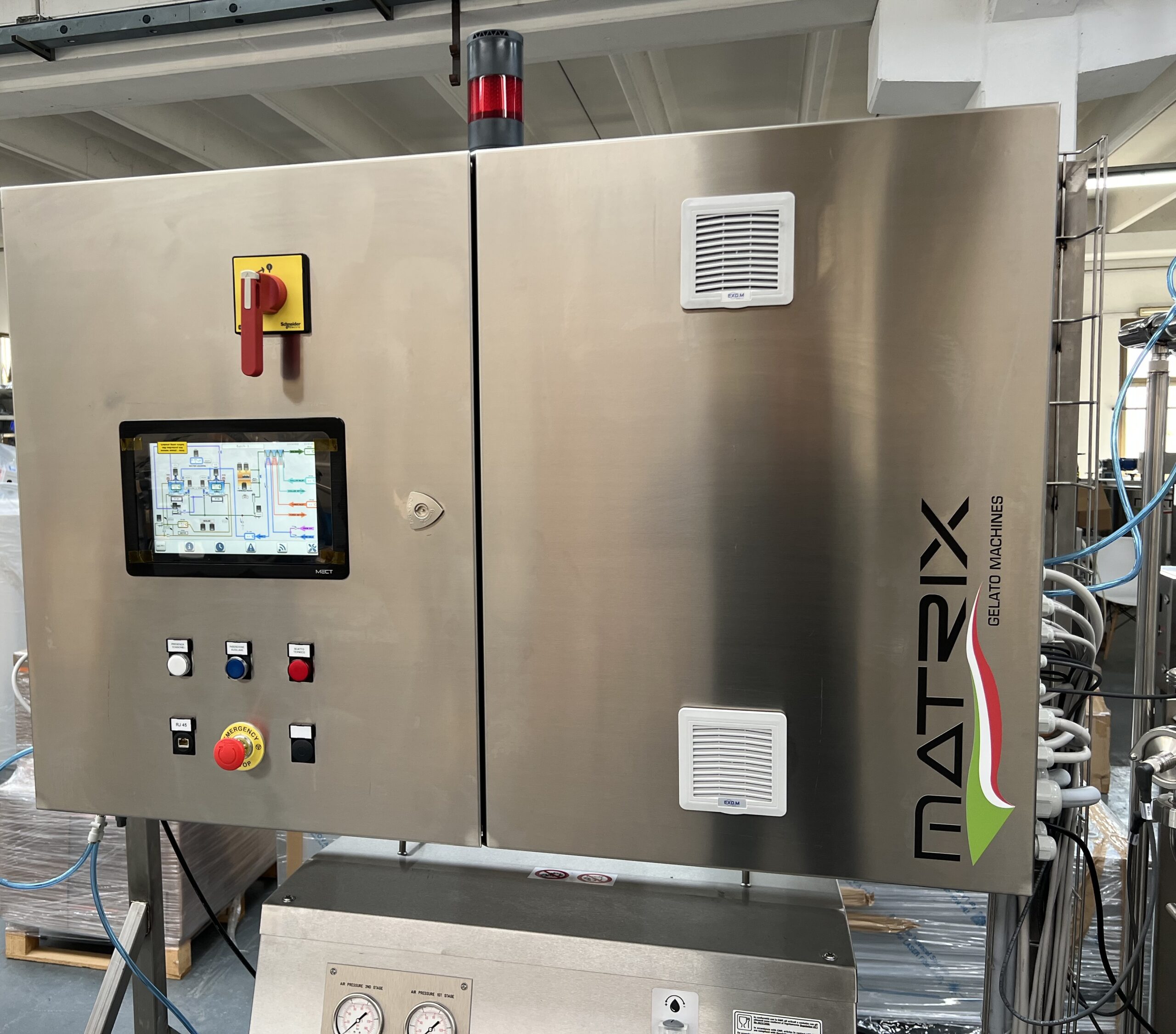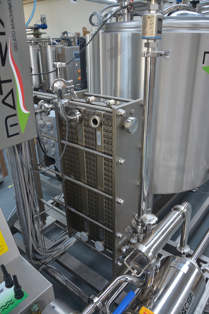 Uno scambiatore di calore a 3 stadi appositamente progettato consente il raffreddamento delle miscele calde tramite l’ingresso di latte o acqua. Il latte/acqua che entra a +4/+14°C nella piastra viene riscaldato tramite miscela calda fino a 55°C.